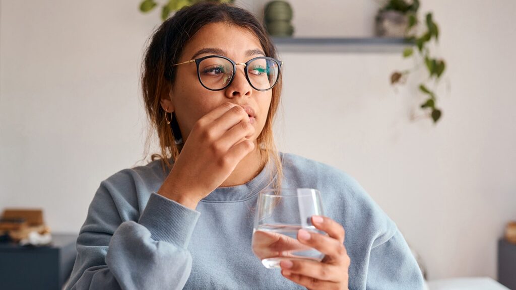 Illustration of a woman holding a PillTrek near her mouth, about to swallow it. (Caltech)
