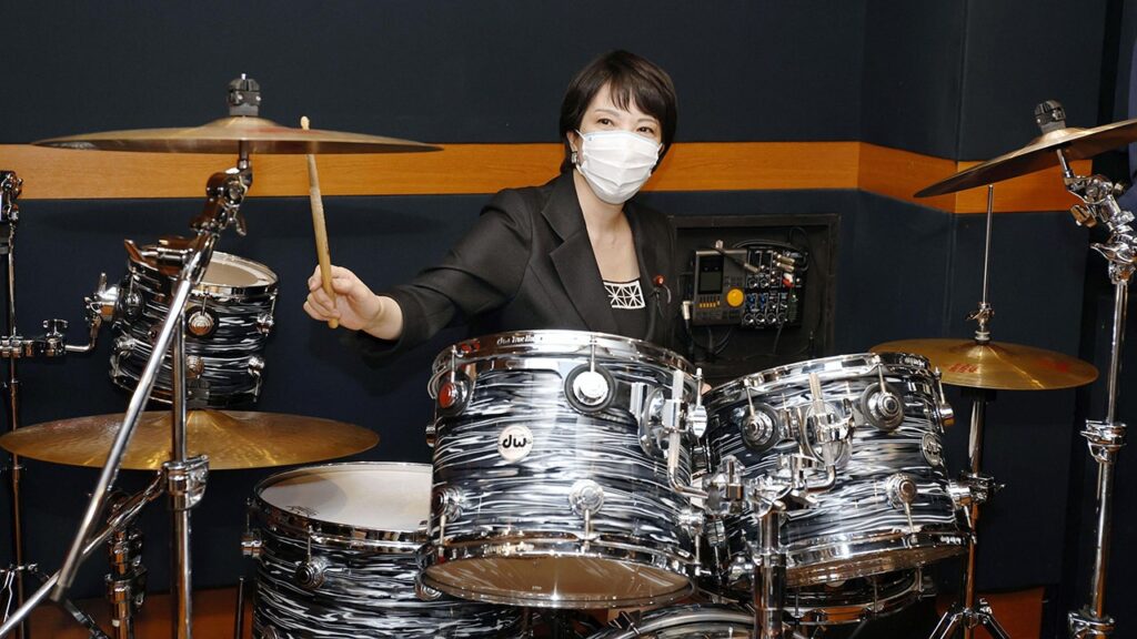 Sanae Takaichi, now Japan’s prime minister, is seen playing drums in Tokyo on Sept. 24, 2021, when she was the internal affairs minister. (Kyodo via Reuters)