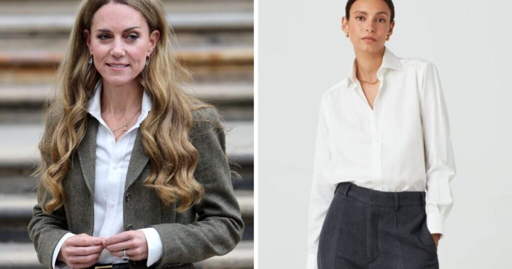 This classic white shirt channels the same polished simplicity as Princess Kate’s design. Available in sizes 8 to 22, it’s made from 100% cotton. The cut is slightly boxy with a pleat at the back, giving it a relaxed yet structured shape that works for both smart and casual styling. While the crisp white version is closest to Kate’s look, it also comes in navy for a versatile wardrobe update.
